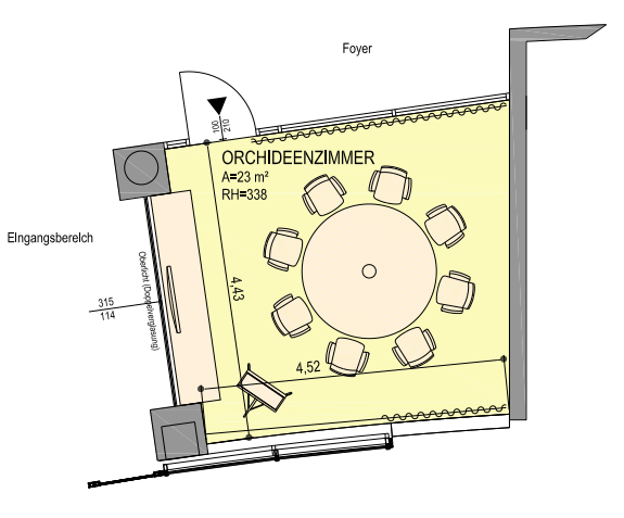 Ein Ort, an dem sich gerne trifft ist der Besprechungsraum Orchideenzimmer mit einer Fläche von 23 m². Der Raum bietet Platz und Kapazität für 10 Teilnehmer bzw. Personen.